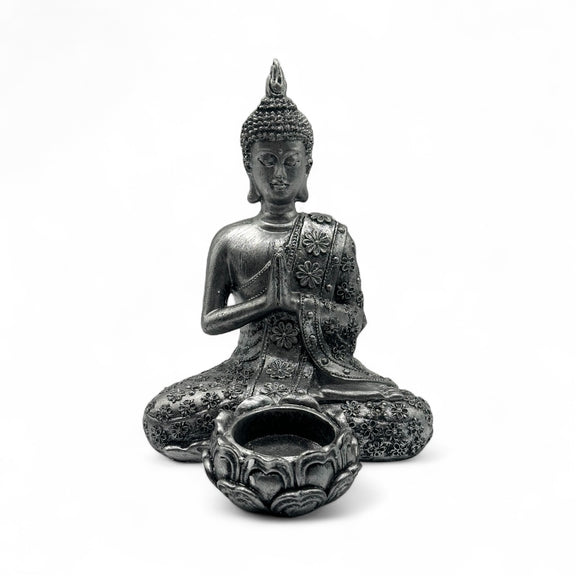Handmade Buddha with Candleholder – Silver-Coloured Polyresin Statue