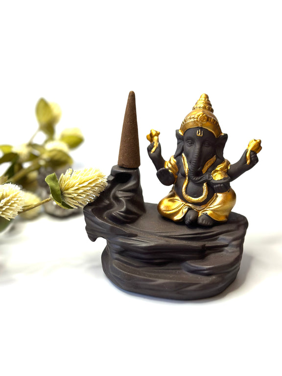 Bring peace, protection, and prosperity into your space with this beautifully crafted Ganesh Backflow Incense Burner. Made from high-quality ceramic, this burner features Lord Ganesh—the revered deity of wisdom and new beginnings—seated gracefully on a rocky base.